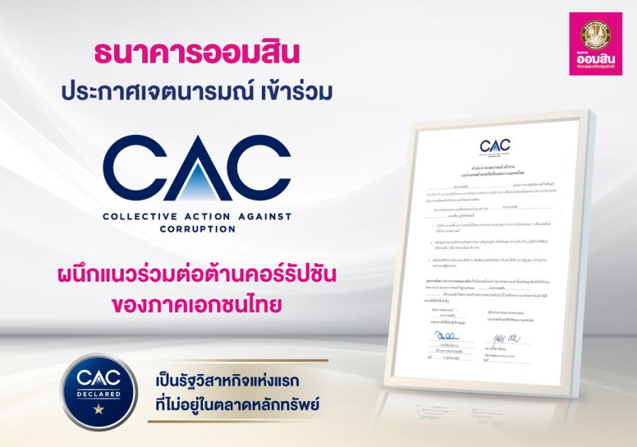 นายวิทัย รัตนากร ผู้อำนวยการธนาคารออมสิน เปิดเผยว่า ธนาคารได้เข้าร่วมเป็นสมาชิกแนวร่วมต่อต้านคอร์รัปชันของภาคเอกชนไทย : Thai Private Sector Collection Action Against Corruption หรือ CAC และเป็นหน่วยงานรัฐวิสาหกิจแห่งแรกที่ไม่อยู่ในตลาดหลักทรัพย์แห่งประเทศไทย ที่ได้เป็นสมาชิก CAC เพื่อเป็นการประกาศเจตนารมณ์ความมุ่งมั่นของธนาคารออมสินในการดำเนินธุรกิจอย่างมีธรรมาภิบาล ยึดมั่นในหลักการกำกับดูแลกิจการที่ดี มีกระบวนการทำงานเพื่อป้องกันการทุจริตและคอร์รัปชัน สอดคล้องกับการดำเนินธุรกิจตามกรอบแนวคิด ESG ซึ่ง G : Governance หรือมิติด้านธรรมาภิบาล เป็นพลังสำคัญในการขับเคลื่อนองค์กรที่ดำเนินกิจการอย่างโปร่งใส ตรวจสอบได้ บุคลากรทั่วทั้งองค์กรมีจิตสำนึกในการต่อต้านการทุจริตทุกรูปแบบ อีกทั้งยังมีเป้าหมายเชิญชวนผู้ประกอบการ พันธมิตร คู่ค้า หรือองค์กรต่าง ๆ เข้าร่วมประกาศเจตนารมณ์ต่อต้านคอร์รัปชัน เพื่อขยายเครือข่ายการต่อต้านคอร์รัปชันต่อไป