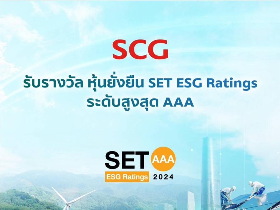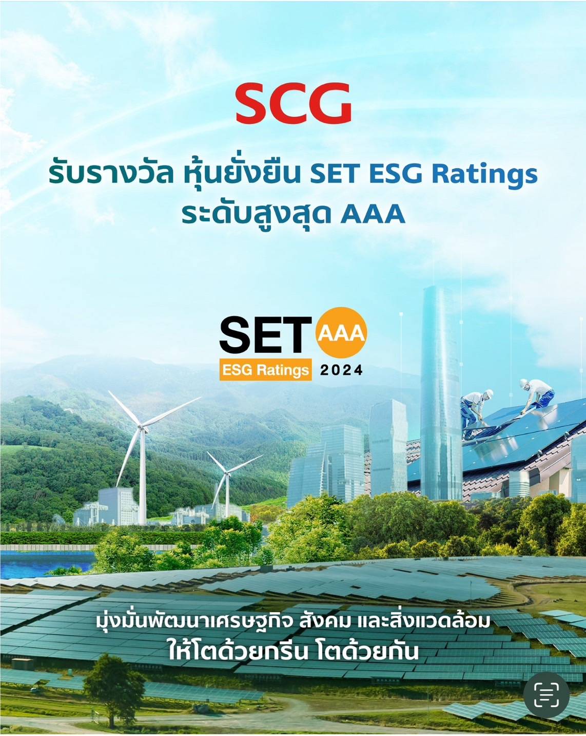 SCG ได้รับการคัดเลือกเป็น “หุ้นยั่งยืน SET ESG Ratings” ระดับ AAA ประจำปี 2567 ซึ่งเป็นระดับสูงสุด จากตลาดหลักทรัพย์แห่งประเทศไทย สะท้อนการดำเนินธุรกิจโดยคำนึงถึงความรับผิดชอบต่อผู้มีส่วนได้ส่วนเสียทุกกลุ่มพร้อมมีส่วนร่วมรับผิดชอบต่อสิ่งแวดล้อม สังคม ผ่านการกำกับดูแลกิจการที่ดีตามหลักบรรษัทภิบาล (ESG : Environmental Social and Governance: ESG) สอดคล้องกับเทรนด์การลงทุนอย่างยั่งยืนด้วยนวัตกรรมกรีน พร้อมขับเคลื่อนเศรษฐกิจ สังคม สิ่งแวดล้อมให้โตด้วยกัน