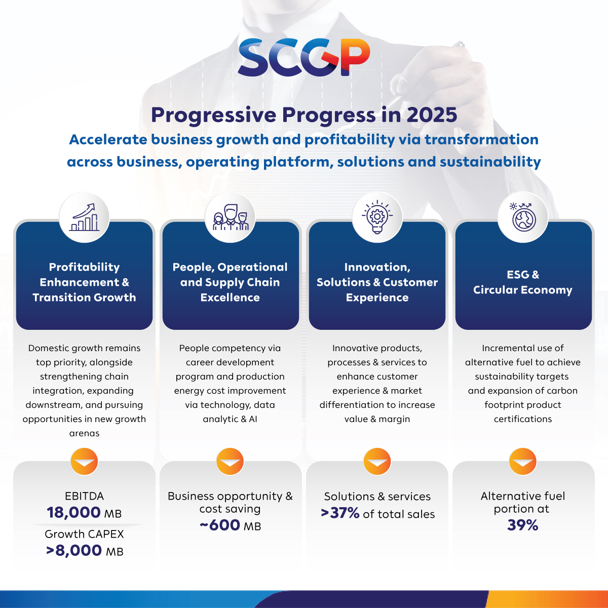ปี 2568 SCGP ได้วางแผนงบลงทุนรวม 13000 ล้านบาท และตั้งเป้าเพิ่ม EBITDA เป็น 18000 ล้านบาท โดยดำเนินงานผ่าน 4 กลยุทธ์หลัก เพื่อการเติบโตอย่างมีคุณภาพ ได้แก่