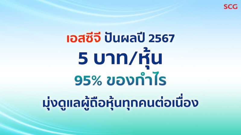 ขณะที่ในไทย การเบิกจ่ายงบประมาณรัฐล่าช้าจากปีก่อน หนี้ครัวเรือนยังอยู่ในระดับสูง สินค้าจีนเข้ามาแข่งขัน ทำให้เอสซีจีคงความแข็งแกร่ง และสามารถดูแลผู้ถือหุ้นทุกคนให้ได้รับผลตอบแทนการลงทุนอย่างต่อเนื่อง ปี 2567 คณะกรรมการบริษัทฯ จึงได้มีมติให้เสนอที่ประชุมผู้ถือหุ้นเพื่ออนุมัติจ่ายเงินปันผลประจำปี ในอัตราหุ้นละ 5.00 บาท รวมเป็นเงิน 6000 ล้านบาท คิดเป็น 95% ของกำไร