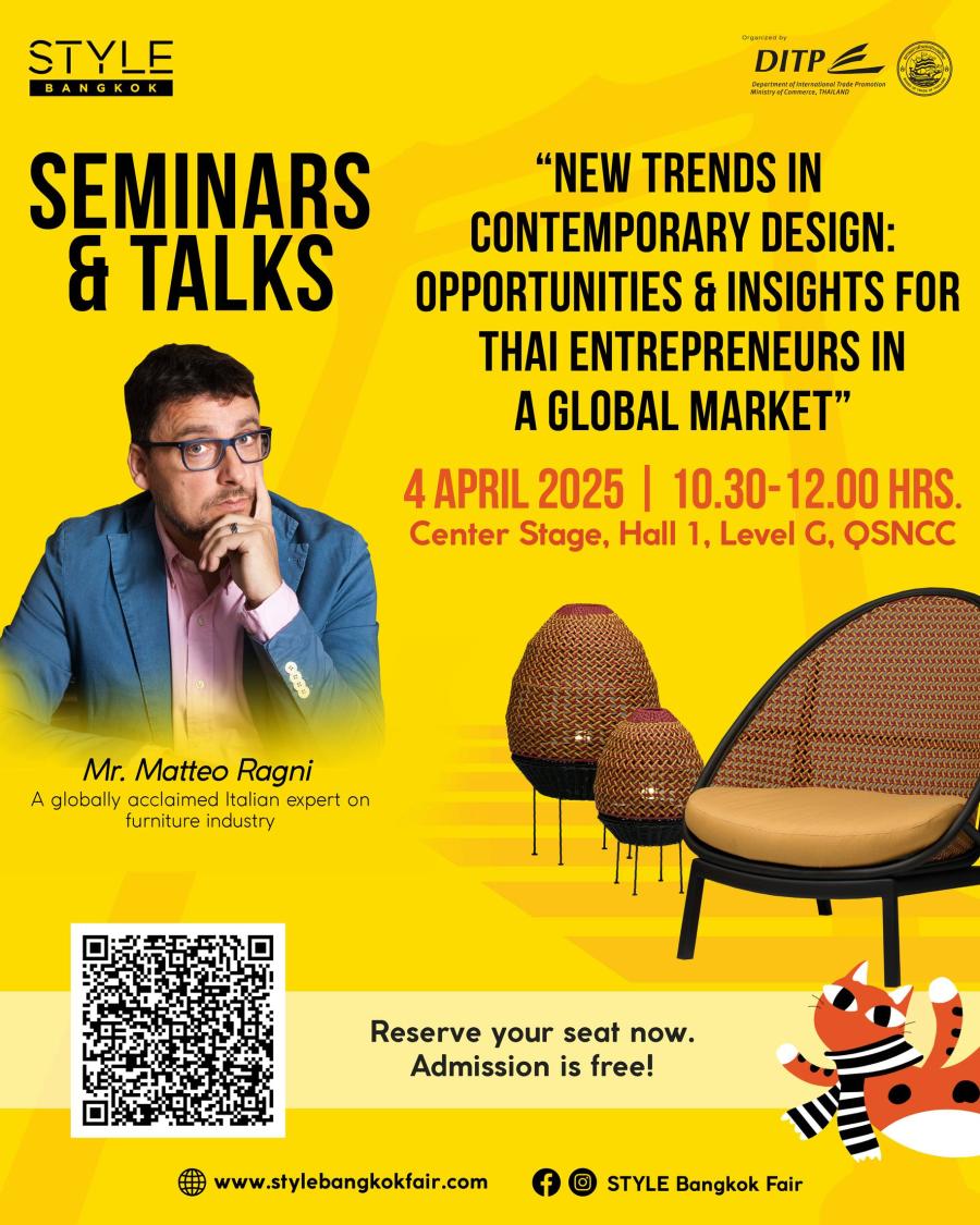 มาร่วมอัพเดทเทรนด์และโอกาสของเฟอร์นิเจอร์ไทยในตลาดยุโรปและในตลาดโลก ในสัมมนาพิเศษ “New Trends in Contemporary Design : Opportunities and Insights for Thai Entrepreneurs in a Global Market” โดย Mr. Matteo Ragni ในงาน “STYLE Bangkok 2025” ซึ่งจัดขึ้นระหว่างวันที่ 2-6 เมษายน 2568