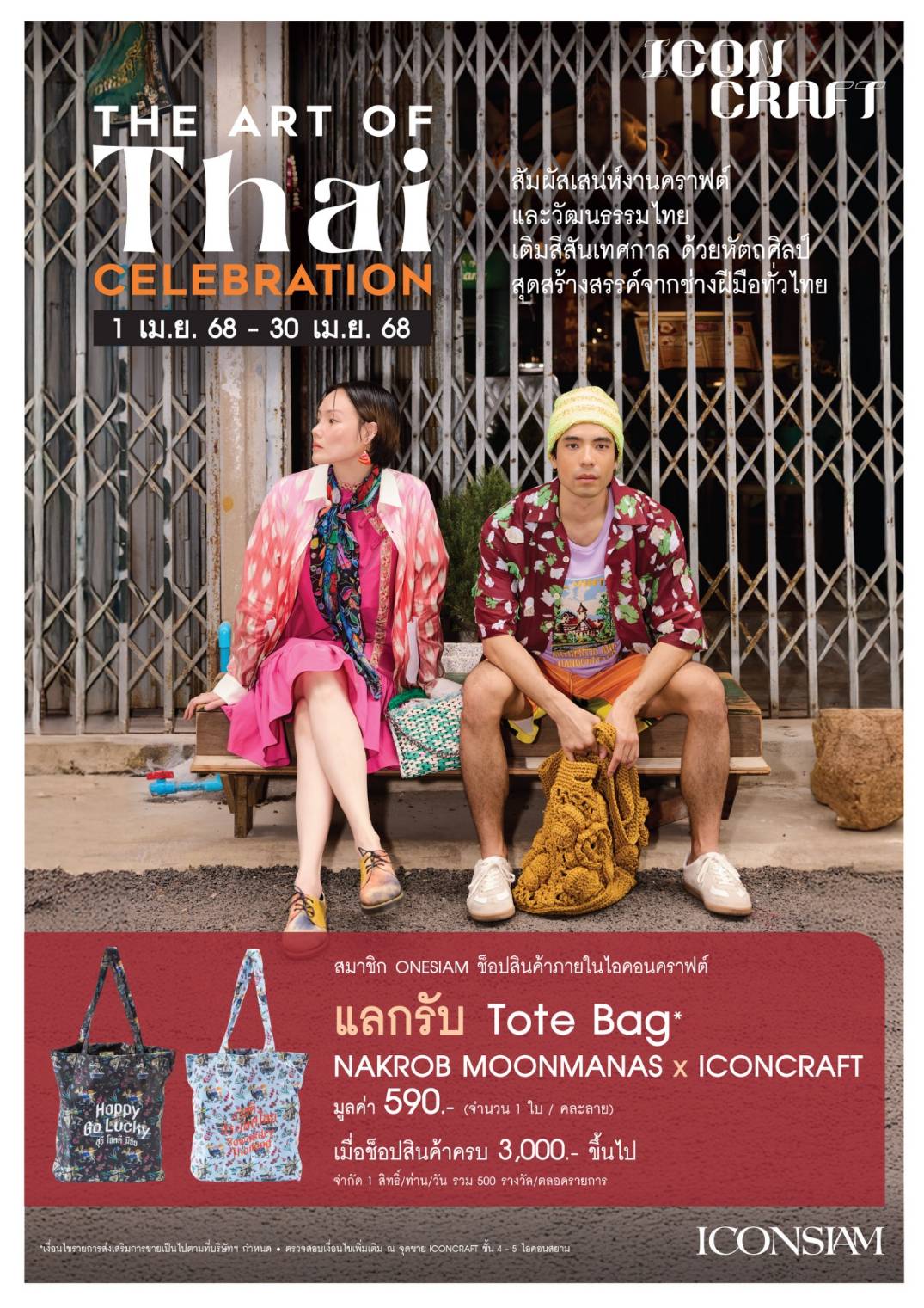 สำหรับสมาชิก ONESIAM และลูกค้าต่างชาติ เพียงซื้อสินค้าภายในร้านไอคอนคราฟต์ ครบ 3000 บาทขึ้นไป/ใบเสร็จ แลกรับ Tote Bag จากคอลเลกชัน ICONCRAFT x NAKROB MOONMANAS มูลค่า 590 บาท ฟรี! จำนวน 1 ใบ (จำกัด 500 รางวัล / ตลอดรายการ)