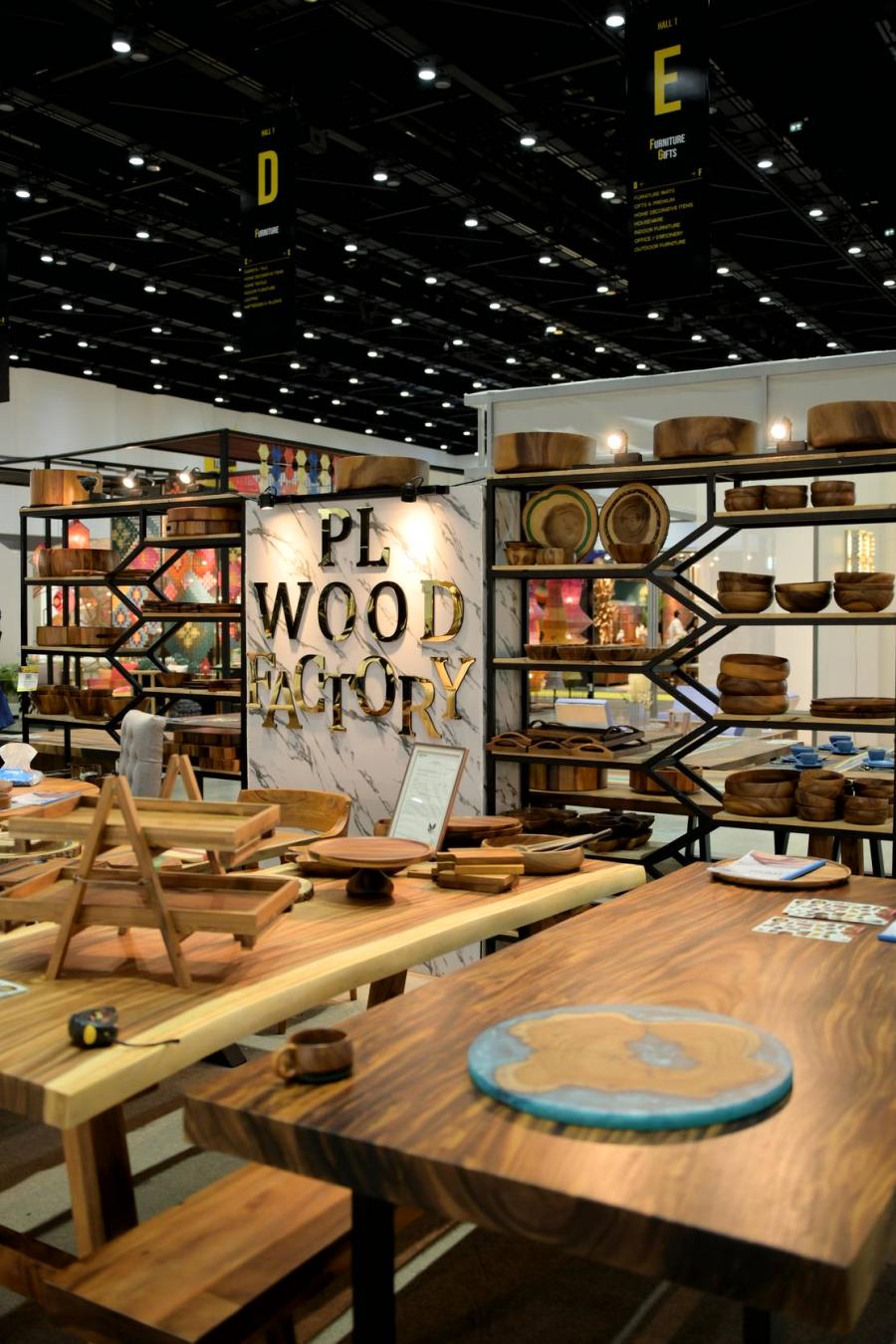 ชนนิกานต์ แลสันกลาง เจ้าของแบรนด์ “PL WOOD FACTORY” จากจังหวัดลำปาง เล่าให้ฟังว่าเธอนำสินค้าอุปกรณ์ของใช้บนโต๊ะอาหารจากไม้สักมาร่วมจำหน่ายในงาน ไม่ว่าจะเป็นเขียงที่เป็นท่อนไม้ทั้งอัน เติมแต่งด้วยสีสดใส แต่ยังคงความธรรมชาติ และยังมีโต๊ะอาหารหลายขนาดที่ทำมาจากไม้ฉำฉา ซึ่งมีลายไม้สวยงาม เป็นเอกลักษณ์เฉพาะตัว ไม้ฉำฉาจากภาคเหนือมีสีที่เข้มมีลายที่คมชัดจากธรรมชาติ มีขนาดใหญ่และหนา อีกทั้งยังแข็งแรงทนทานใช้งานได้ยาวนาน