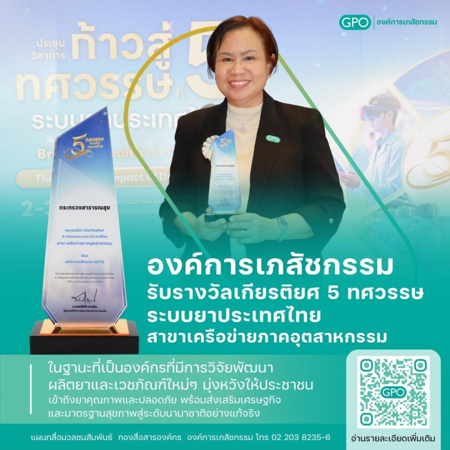 องค์การเภสัชกรรมรับรางวัลเกียรติยศ 5 ทศวรรษระบบยาประเทศไทย สาขาเครือข่ายภาคอุตสาหกรรม ในฐานะที่เป็นองค์กรที่มีการวิจัยพัฒนา ผลิตยาและเวชภัณฑ์ใหม่ๆ มุ่งหวังให้ประชาชนเข้าถึงยาคุณภาพและปลอดภัย พร้อมส่งเสริมเศรษฐกิจและมาตรฐานสุขภาพสู่ระดับนานาชาติอย่างแท้จริง