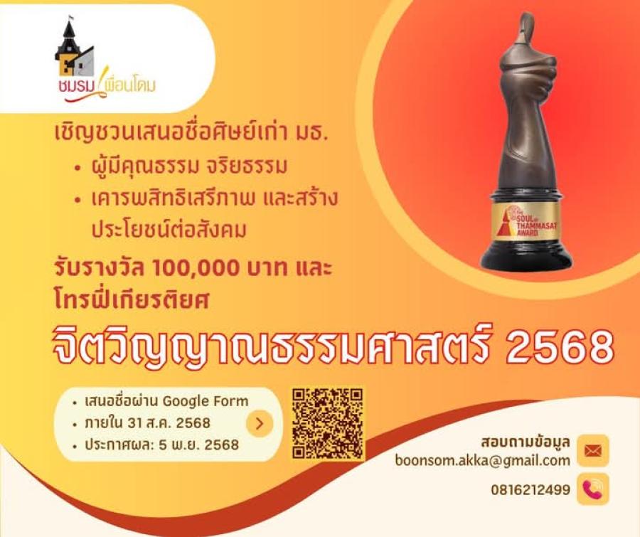 รางวัลจิตวิญญาณธรรมศาสตร์ 2568 เชิญชวนเสนอชื่อศิษย์เก่า ม.ธรรมศาสตร์ ผู้มีคุณธรรม จริยธรรม เคารพสิทธิเสรีภาพ และสร้างประโยชน์ต่อสังคม รางวัล 100000 บาท โทรฟี่เกียรติยศ