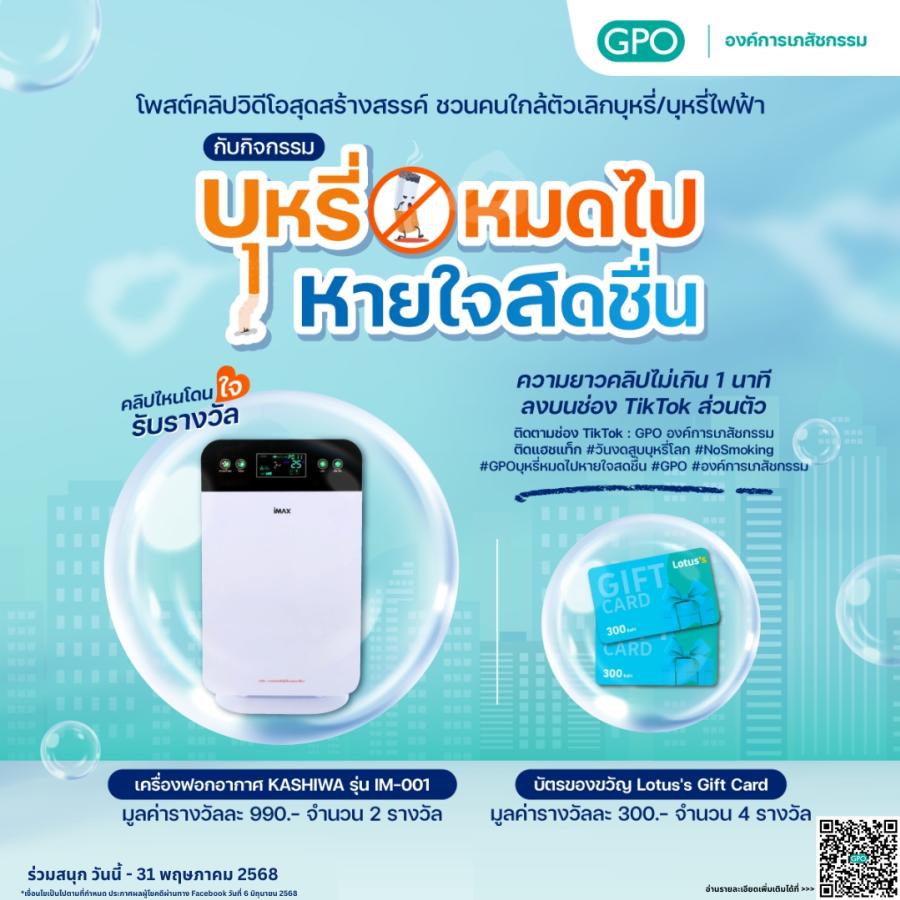 องค์การเภสัชกรรมเชิญร่วมสนุกกับกิจกรรม ”บุหรี่หมดไป หายใจสดชื่น” เพียงโพสต์ คลิปวิดีโอสั้นๆ ชวนคนใกล้ตัวเลิกบุหรี่/บุหรี่ไฟฟ้า ลุ้นรับรางวัลกว่า 3000 บาท