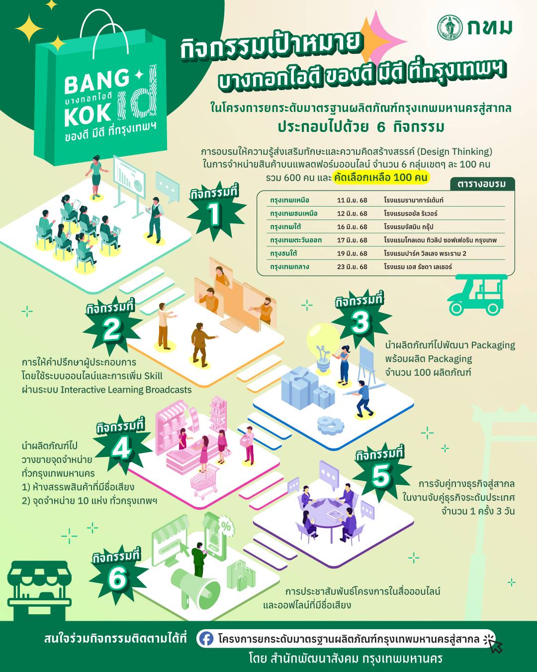 กรุงเทพมหานคร โดยสำนักพัฒนาสังคม เตรียมเปิดตัวโครงการยกระดับมาตรฐานผลิตภัณฑ์กรุงเทพมหานครสู่สากล ภายใต้แนวคิด “บางกอกไอดี ของดี มีดี ที่กรุงเทพฯ” ที่สะท้อนเอกลักษณ์ วัฒนธรรม และความคิดสร้างสรรค์ของกรุงเทพฯ ผ่านผลิตภัณฑ์กรุงเทพมหานคร พร้อมขับเคลื่อนให้เป็นที่รู้จักในวงกว้าง โดยมีเป้าหมายส่งเสริมผู้ประกอบการกรุงเทพมหานคร ให้สามารถเข้าถึงองค์ความรู้ พัฒนาสินค้า เพิ่มช่องทางการจัดจำหน่ายและเข้าถึงตลาดระดับประเทศและระดับสากล