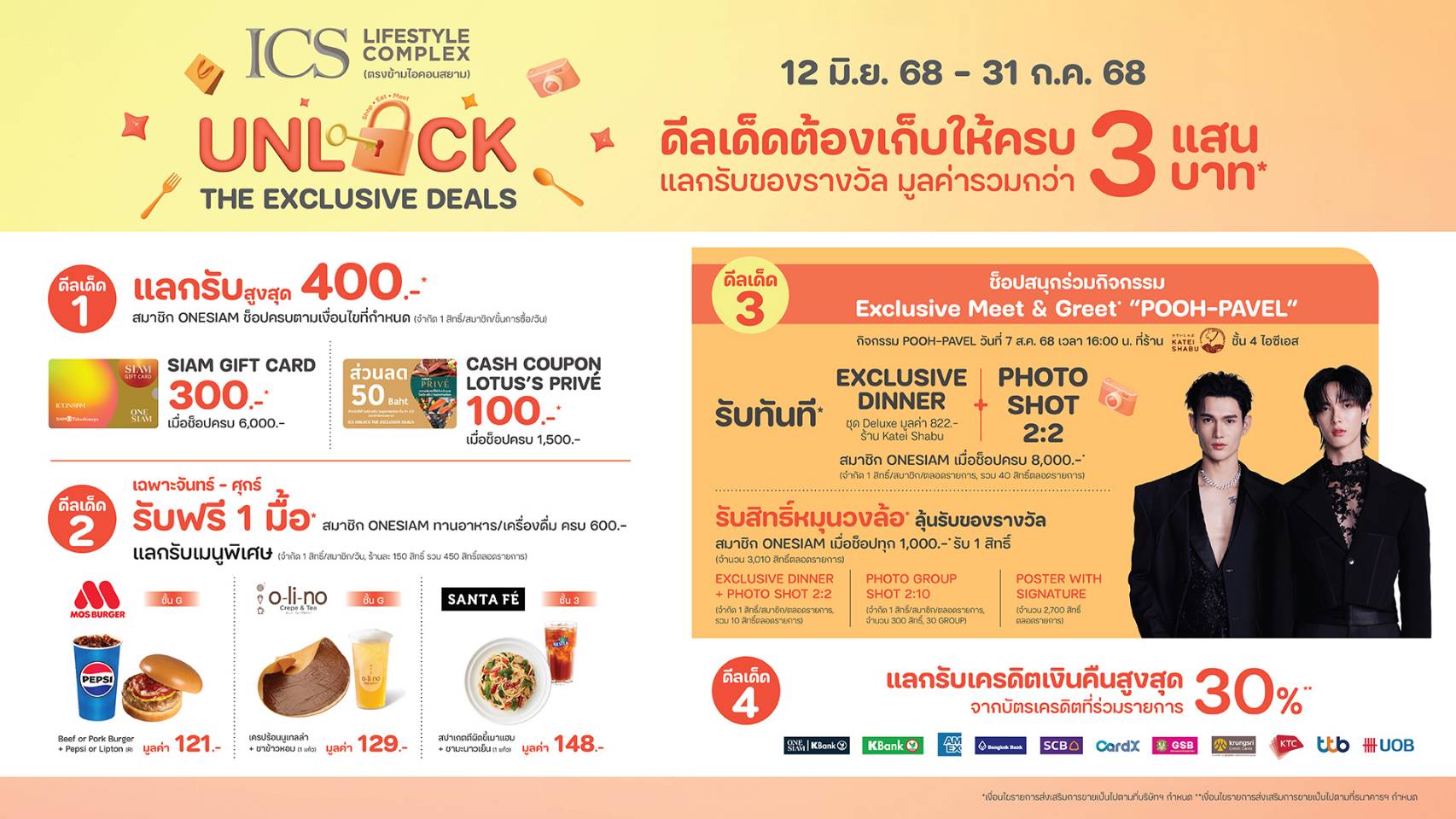ICS Lifestyle Complex จัดโปรโมชั่นแรงเอาใจกลุ่มลูกค้าทั้งนักช็อปและนักชิมกับแคมเปญ “ICS UNLOCK THE EXCLUSIVE DEALS” ดึงดูดใจด้วยหลายดีลเด็ด ให้สมาชิก ONESIAM และลูกค้าไอซีเอสได้คุ้มทุกการจับจ่าย