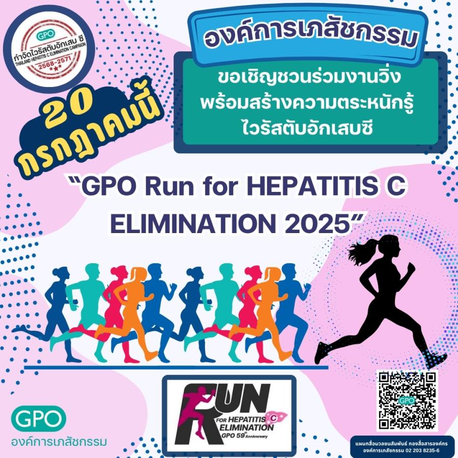 องค์การเภสัชกรรมจึงรณรงค์สร้างความตระหนักรู้เกี่ยวกับโรคไวรัสตับอักเสบ C และส่งเสริมให้ประชาชนออกกำลังกายอย่างสม่ำเสมอ ซึ่งเป็นปัจจัยในการสร้างภูมิคุ้มกันและลดความเสี่ยงต่อการเกิดโรคผ่านการจัดงานวิ่ง “GPO Run for HEPATITIS C ELIMINATION 2025” ไวรัสตับอักเสบซี ตรวจเร็ว รักษาทันป้องกันมะเร็งตับ ในวันที่ 20 กรกฎาคม 2568 เริ่มปล่อยตัวเวลา 4.45 น. ณ องค์การเภสัชกรรม ถนนพระราม 6 กรุงเทพมหานคร ภายในงาน ให้บริการตรวจคัดกรองไวรัสตับอักเสบซี และนิทรรศการให้ความรู้ไวรัสตับอักเสบซี เป็นต้น