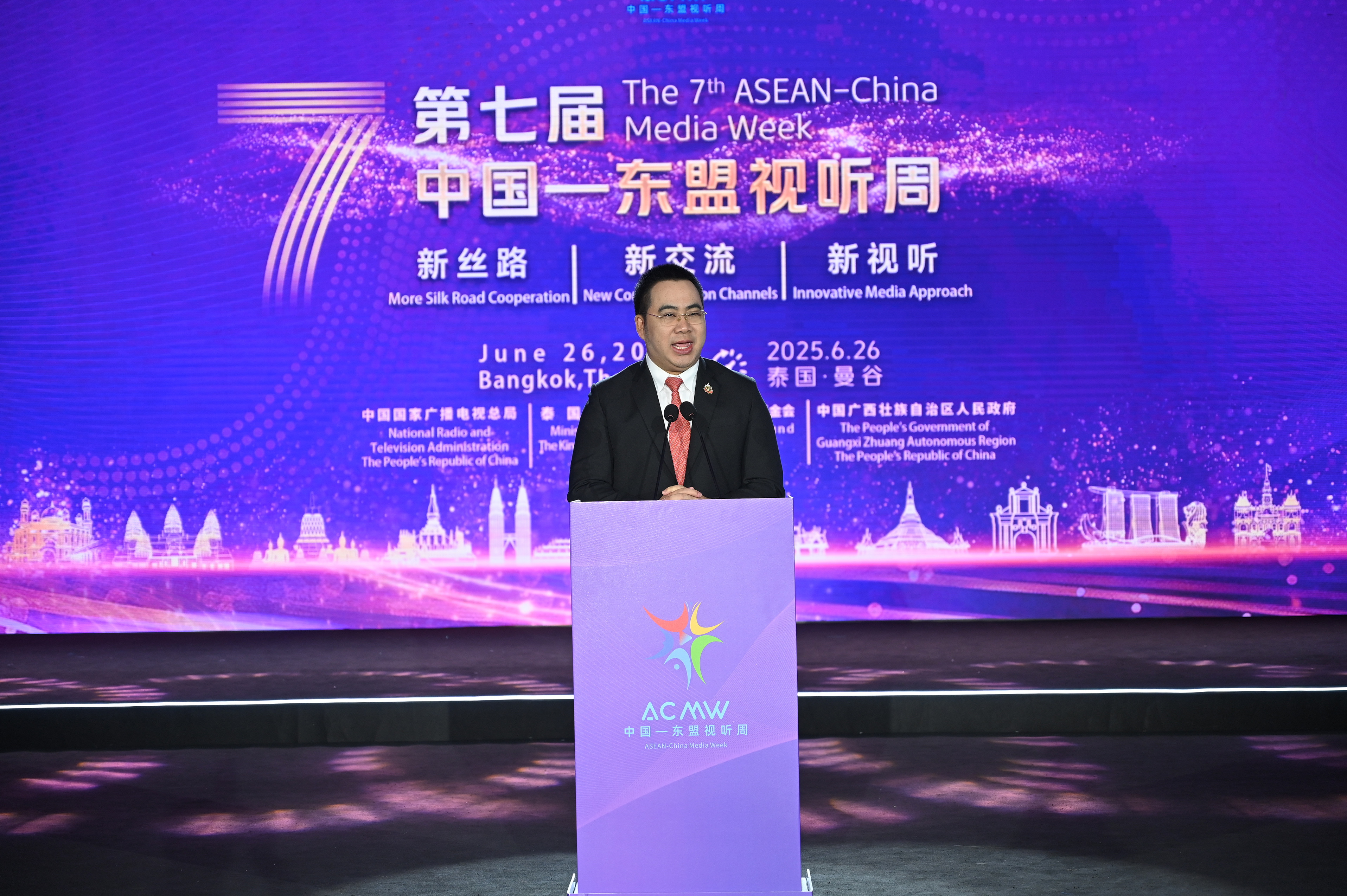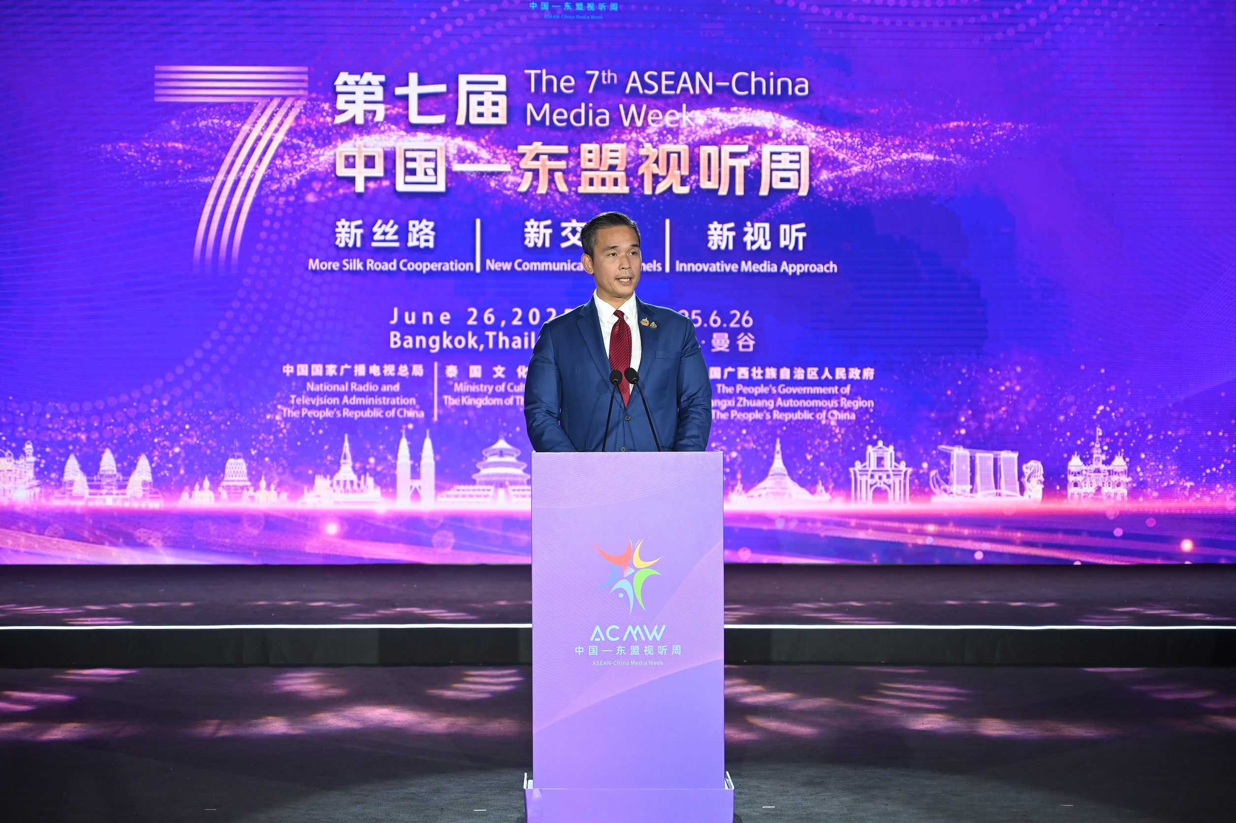 งานสัปดาห์สื่ออาเซียน-จีน ครั้งที่ 7 (The 7th ASEAN-China Media Week) ภายใต้หัวข้อ “มุ่งสร้างเส้นทางสายไหมยุคใหม่ ผ่านความร่วมมือสื่อสร้างสรรค์” (More Silk Road Cooperation New Chapter Communication Innovative Media Approach) จัดโดย สำนักงานวิทยุและโทรทัศน์แห่งชาติจีน (NRTA) รัฐบาลเขตปกครองตนเองกว่างซีจ้วง สาธารณรัฐประชาชนจีน กระทรวงวัฒนธรรม และกองทุนพัฒนาสื่อปลอดภัยและสร้างสรรค์ ในวาระครบรอบ 50 ปีแห่งการสถาปนาความสัมพันธ์ทางการทูตระหว่างประเทศไทยและสาธารณรัฐประชาชนจีน หรือ “ปีทองแห่งมิตรภาพไทย–จีน” ระหว่างวันที่ 26 มิถุนายน - 3 กรกฎาคม 2568 ณ กรุงเทพฯ