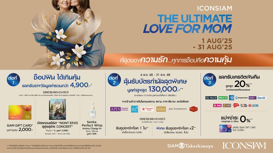 แคมเปญ "ICONSIAM THE ULTIMATE LOVE FOR MOM" จัดขึ้นภายใต้แนวคิด ‘มอบที่สุดของความรัก’ ผ่าน ‘ที่สุดของประสบการณ์’ เพื่อส่งมอบประสบการณ์และผลิตภัณฑ์ที่ช่วยเติมเต็มความงามและสุขภาพของแม่ทุกคน ตลอดทั้งเดือนสิงหาคมนี้ โดยมอบดีลสุดพิเศษ มูลค่าของรางวัลรวมกว่า 4 ล้านบาท ซึ่งรวบรวมของขวัญสุดพิเศษจากแบรนด์ระดับโลก ทั้งแฟชั่น เครื่องประดับ ความงาม และไลฟ์สไตล์ พร้อมร้านอาหารชั้นนำในบรรยากาศริมแม่น้ำเจ้าพระยาสุดโรแมนติก เพื่อให้เป็นช่วงเวลาแห่งความรักอย่างแท้จริง