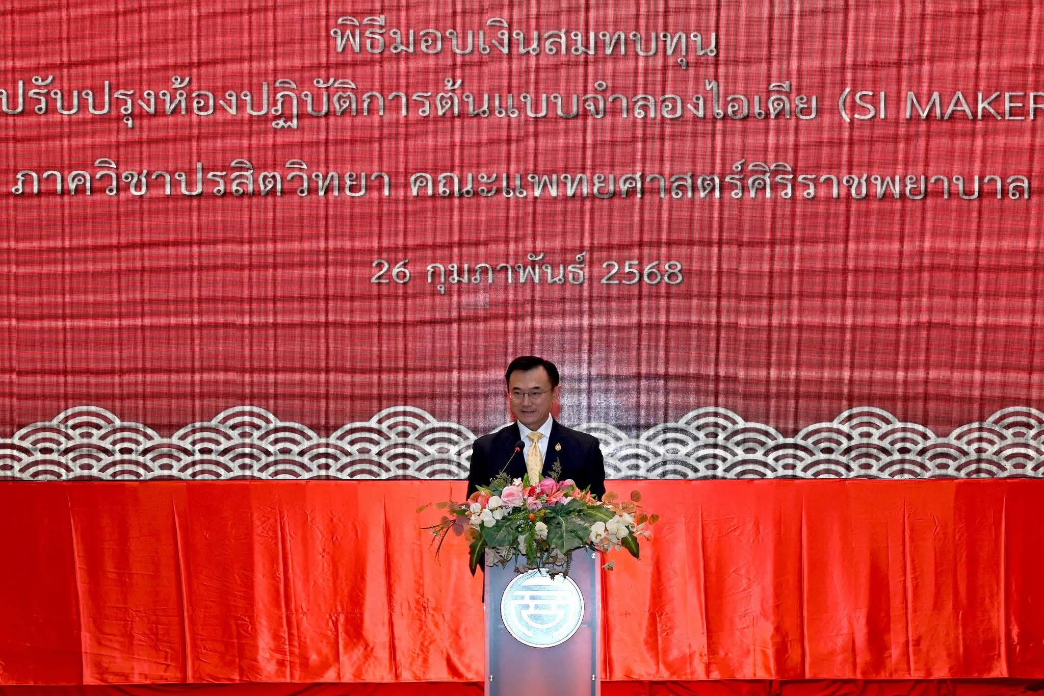 พร้อมด้วย นายชาลี แซ่ลิ้ม รองเลขาธิการรบริหาร และประธานมูนิธิเพื่อสัมพันธภาพไทย-จีน และ นายกุ้ยหยาง โชว ผู้อำนวยการฝ่ายสวัสดิการและการกุศล และรองประธานมูลนิธิเพื่อสัมพันธภาพไทย-จีน ร่วมส่งมอบเงินบริจาคแก่คณบดี คณะแพทยศาสตร์ศิริราชพยาบาล เพื่อร่วมสมทบทุน “โครงการปรับปรุงห้องปฏิบัติการต้นแบบจำลอง (SI Makerspace)” ภาควิชาปรสิตวิทยา จำนวน 10 ล้านบาท เพื่อช่วยขับเคลื่อนให้โครงการนี้บรรลุเป้าหมายและเกิดประโยชน์แก่ทางการแพทย์และสังคมโดยรวม