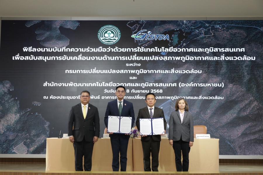 วันที่ 8 กันยายน 2568 กรมการเปลี่ยนแปลงสภาพภูมิอากาศและสิ่งแวดล้อม (กรมลดโลกร้อน)และสำนักงานพัฒนาเทคโนโลยีอวกาศและภูมิสารสนเทศ (องค์การมหาชน) (GISTDA) ลงนาม “บันทึกความร่วมมือว่าด้วยการใช้เทคโนโลยีอวกาศและภูมิสารสนเทศ เพื่อสนับสนุนการขับเคลื่อนงานด้านการเปลี่ยนแปลงสภาพภูมิอากาศและสิ่งแวดล้อม” โดยมี ดร.พิรุณ สัยยะสิทธิ์พานิช อธิบดีกรมการเปลี่ยนแปลงสภาพภูมิอากาศและสิ่งแวดล้อม และ ดร.ปกรณ์ อาภาพันธุ์ ผู้อำนวยการสำนักงานพัฒนาเทคโนโลยีอวกาศและภูมิสารสนเทศร่วมลงนาม ณ ห้องประชุมอารีย์สัมพันธ์ อาคารกรมการเปลี่ยนแปลงสภาพภูมิอากาศและสิ่งแวดล้อม