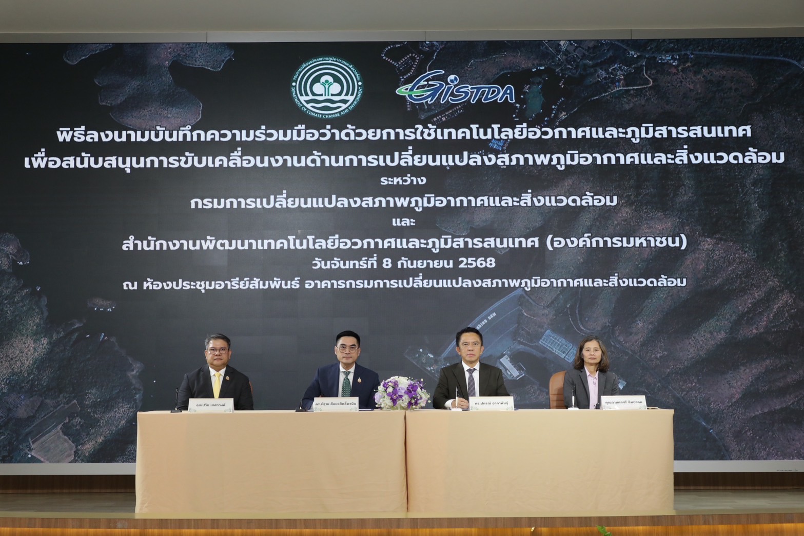 ด้าน ดร.ปกรณ์ อาภาพันธุ์ ผู้อำนวยการ GISTDA กล่าวว่า GISTDA ได้ร่วมมือกับกรมลดโลกร้อน ใช้ข้อมูลจากดาวเทียมและระบบภูมิสารสนเทศเป็นกลไกสนับสนุนเชิงนโยบาย สำหรับการจัดทำมาตรการลดก๊าซเรือนกระจก การติดตามสถานการณ์สิ่งแวดล้อม และการวิเคราะห์ความเสี่ยงจากภัยพิบัติ โดย GISTDA มีแหล่งข้อมูลที่สำคัญจากเทคโนโลยีอวกาศและภูมิสารสนเทศที่จะมาร่วมสนับสนุน เช่น ข้อมูลการใช้ประโยชน์ที่ดินพื้นที่น้ำท่วม-น้ำแล้งซ้ำซาก อุณหภูมิพื้นที่ผิว จุดความร้อน พื้นที่เผาไหม้ พื้นที่เกษตร การกัดเซาะชายฝั่ง พื้นที่สีเขียว การเปลี่ยนแปลงการใช้ประโยชน์ที่ดิน การวิเคราะห์และจัดทำแผนที่ความเสี่ยง กา