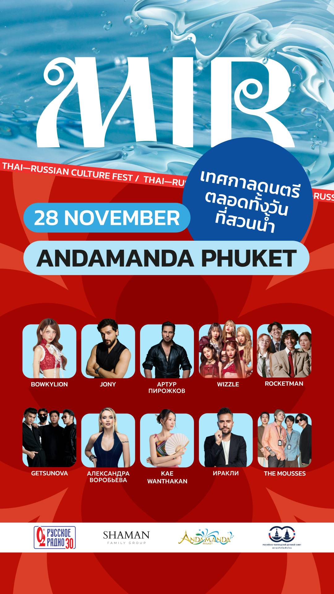 ในส่วนของกิจกรรมทางวัฒนธรรม ไฮไลท์ที่พลาดไม่ได้คือ MIR Thai–Russian Cultural Festival เทศกาลทางวัฒนธรรมเปี่ยมสีสันที่จะจัดขึ้นอย่างยิ่งใหญ่ในวันที่ 28 พฤศจิกายน ที่อันดามันดา สวนน้ำขนาดใหญ่ที่สุดของภูเก็ต เพื่อเฉลิมฉลองครบรอบ 30 ปีของ Russian Radio และเป็นกิจกรรมส่งท้ายของเวทีเสวนาจากความร่วมมือทางการค้าสู่วัฒนธรรมได้อย่างลงตัว ศิลปินชื่อดังของรัสเซียจากเวทีคอนเสิร์ต Golden Gramophone Award เช่น JONY Irakli และ Alexandra Vorobyova จะมาร่วมสร้างความบันเทิงกับศิลปินระดับแนวหน้าของไทย ได้แก่ Bowkylion Getsunova Kae Wanthakan Wizzle Rocketman และ The Mousses นอกจากจะสนุกกับเสียงเพลงกันอย่างเต็มที่แล้ว ในงานยังมีอาหารที่คัดสรรและพื้นที่สร้างสรรค์ของทั้งสองประเทศเพื่อเชื่อมโยงความสัมพันธ์และแลกเปลี่ยนวัฒนธรรมอันเป็นส่วนหนึ่งของความร่วมมือทางเศรษฐกิจที่เติบโตขึ้นอย่างต่อเนื่อง