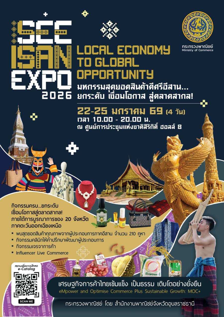 กระทรวงพาณิชย์ โดยสำนักงานพาณิชย์จังหวัดอุบลราชธานี เดินหน้าขับเคลื่อนนโยบายยกระดับเศรษฐกิจฐานรากภาคตะวันออกเฉียงเหนืออย่างเป็นรูปธรรม เตรียมจัดงาน “SEE ISAN EXPO 2026 (ศรีอีสานเอ็กซ์โป)” ภายใต้โครงการยกระดับการค้าภาคอีสานสู่ศูนย์กลางเศรษฐกิจของอนุภูมิภาคลุ่มแม่น้ำโขง ประจำปีงบประมาณ พ.ศ. 2569 เพื่อพัฒนาและเชื่อมโยงศักยภาพเศรษฐกิจท้องถิ่น (Local Economy) สู่โอกาสทางการค้าในระดับประเทศ และนานาชาติ (Global Opportunity) ระหว่างวันที่ 22–25 มกราคม 2569 ณ ฮอลล์ 8 ชั้น LG ศูนย์การประชุมแห่งชาติสิริกิติ์ กรุงเทพมหานคร เปิดให้เข้าชมฟรีทุกวัน เวลาระหว่าง 10.00–20.00 น.