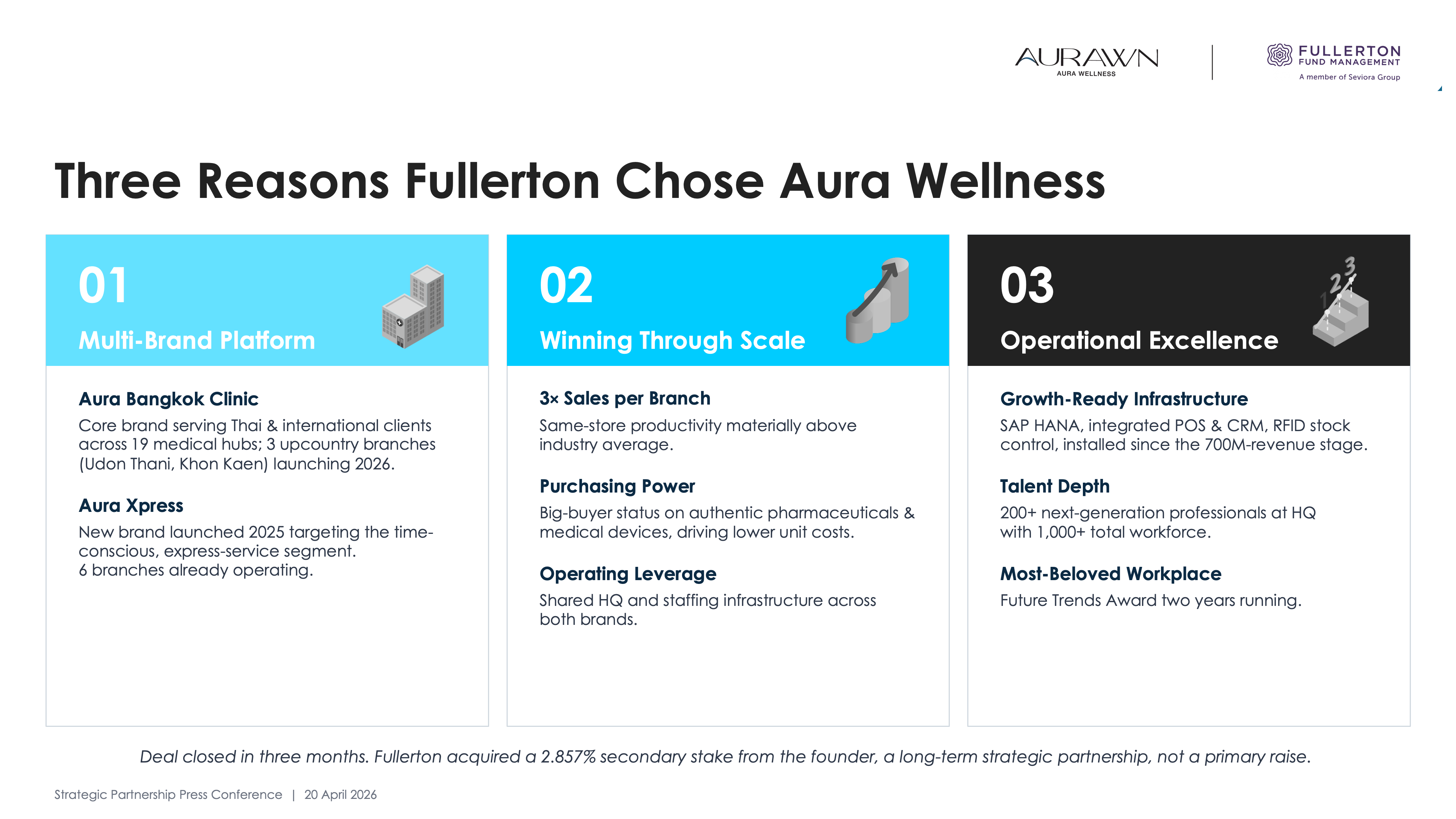 ทั้งนี้ การเชื่อมโยงความร่วมมือในครั้งนี้เกิดขึ้นโดยการสนับสนุนของคุณ Albert Wu จาก 10Bridge ซึ่งเป็น Local Partner ของ Fullerton Thai Private Equity และเป็นผู้มีบทบาทสำคัญในการประสานความร่วมมือระหว่างกองทุน Fullerton กับบริษัท Aura Wellness โดยเป้าหมายของเราคือการผลักดันให้ประเทศไทยเป็น Wellness Destination ของโลกอย่างแท้จริง ด้วยระบบบริหารจัดการที่โปร่งใส และได้มาตรฐานสากลที่เราวางรากฐานไว้ ซึ่งทำให้เราพร้อมรองรับการขยายตัวอย่างเป็นระบบในอนาคต”