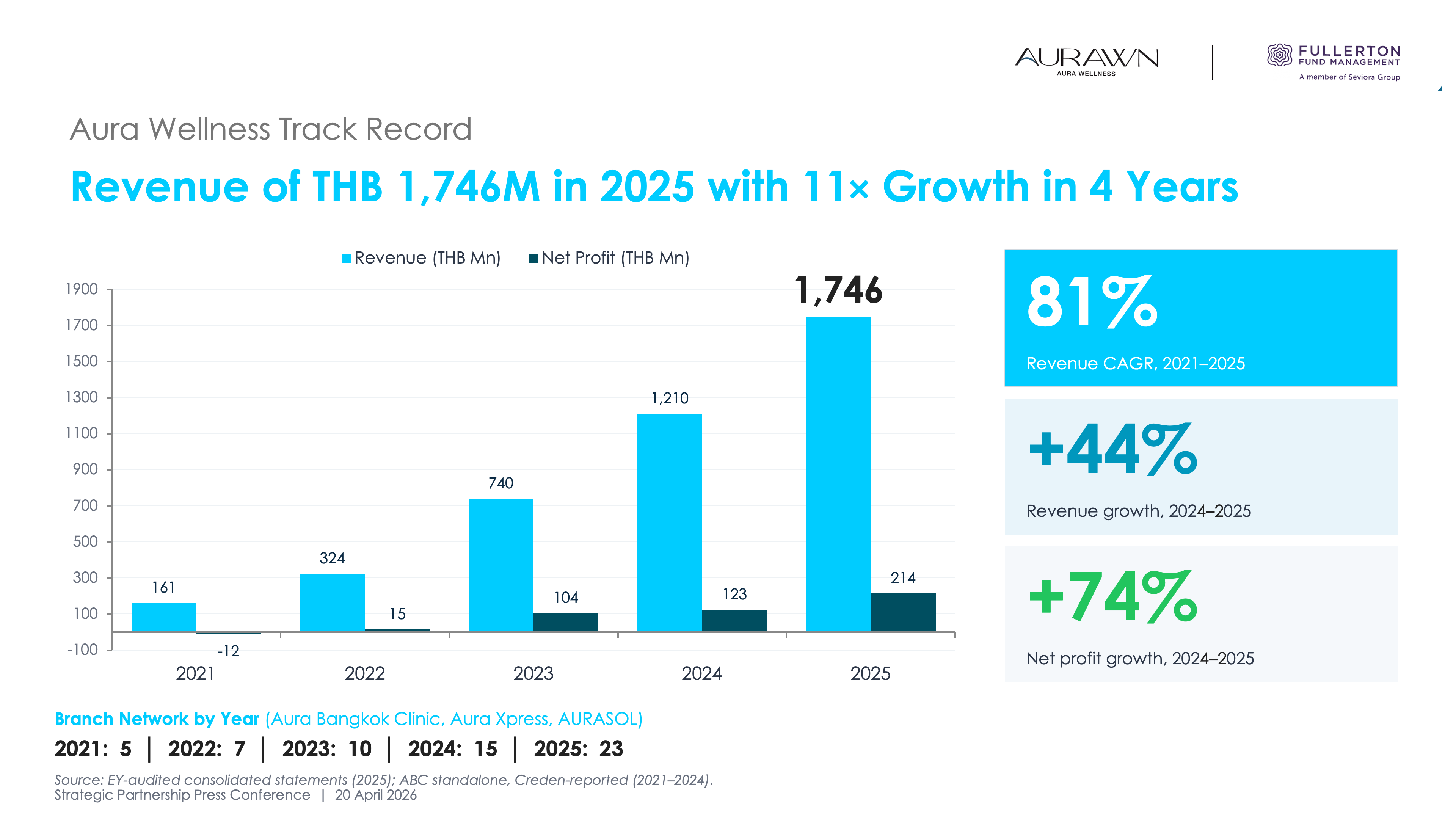 ในปีที่ผ่านมา Aura Wellness ทำรายได้รวมสูงถึง 1746 ล้านบาท เติบโตขึ้น 81% มีกำไรสุทธิ 214 ล้านบาท เพิ่มขึ้น 74% เมื่อเทียบกับปี 2024 โดยมีจุดแข็งสำคัญอยู่ที่ยอดขายต่อสาขาของ Aura Bangkok Clinic ที่สูงกว่าค่าเฉลี่ยตลาดถึง 3 เท่า รวมถึงความสำเร็จของแบรนด์น้องใหม่อย่าง Aura Xpress ที่ทำรายได้ทะลุ 100 ล้านบาทได้ภายในเวลาเพียงครึ่งปี ความสำเร็จดังกล่าว ส่งผลให้ Fullerton Fund Management หนึ่งในกองทุนที่น่าเชื่อถือที่สุดของสิงคโปร์ ตัดสินใจเข้าลงทุนในรูปแบบรายการหุ้น โดย Aura Wellness เป็นบริษัทไทยเพียงรายเดียวในกลุ่ม Wellness ที่ได้รับการคัดเลือก สะท้อนให้เห็นว่าธุรกิจ Aesthetic Medical ของไทยมีศักยภาพสูงในสายตานักลงทุนต่างชาติ สอดคล้องกับเทรนด์ Medical Tourism ของไทยที่มีอัตราการเติบโตเฉลี่ย 10.49% ต่อปี