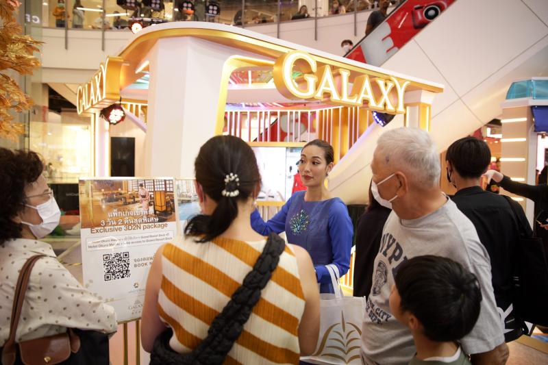 การออกแบบบูธของ Galaxy Macau ได้รับแรงบันดาลใจจากสนามกีฬาในร่มเปิดใหม่อย่าง Galaxy Arena ภายในพื้นที่แบบอินเทอร์แอกทีฟนี้ถูกสร้างให้เป็น “เวทีดาวเด่น” ซึ่งเป็นเวทีสุดอลังการที่มาพร้อมกับกับระบบแสง สี เสียงอันทรงพลัง ให้ความรู้สึกราวกับว่าได้ยืนอยู่บนเวทีจริงของ Galaxy Arena โดยผู้เข้าร่วมงานสามารถแวะเยี่ยมชมบูธของ Galaxy Macau พร้อมกับขึ้นมายืนถ่ายภาพบนเวทีแบบพาโนรามา 360° และถ่ายรูปกับมาสคอตของทางโรงแรม เพื่อเก็บภาพบรรยากาศแสนสุขสันต์ นอกจากนี้ผู้เข้าร่วมงานยังสามารถจับจองแพ็กเกจโรงแรมระดับ 5 ดาว และรับฟังข้อเสนอพร้อมโปรโมชันสุดพิเศษที่ยกขบวนมามอบให้กับทุกท่านในบูธอีกด้วย