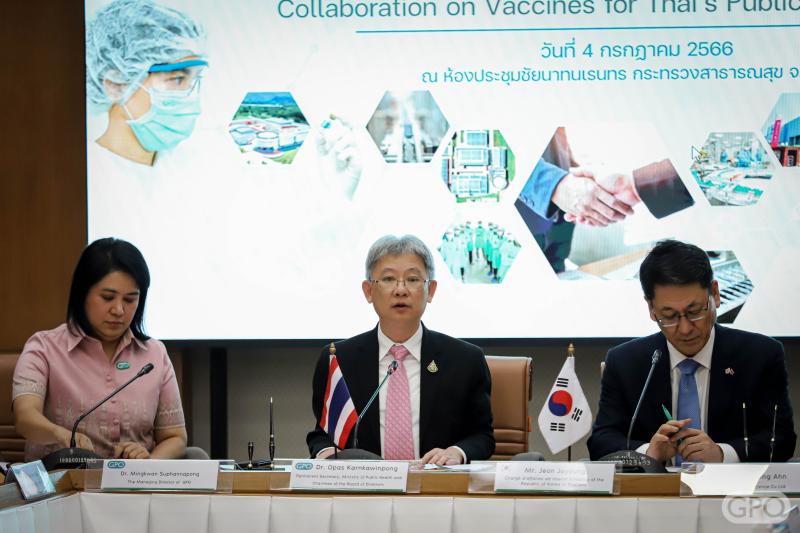 นายแพทย์โอภาส การย์กวินพงศ์ ปลัดกระทรวงสาธารณสุข และประธานกรรมการองค์การเภสัชกรรม กล่าวว่า ประเทศไทยมีนโยบายการดูแลสุขภาพของประชากรทุกคน โดยเฉพาะเรื่องการให้บริการวัคซีน ซึ่งเป็นเครื่องมือสร้างเสริมภูมิคุ้มกันโรคเพื่อป้องกัน ควบคุม ลดการป่วยรุนแรงและสร้างภูมิคุ้มกันหมู่ เช่นเดียวกับประเทศต่างๆ ทั่วโลก โดยเฉพาะในช่วงการระบาดของโควิด-19 การฉีดวัคซีนให้กับประชาชนอย่างทั่วถึงและรวดเร็วถือเป็นมาตรการสำคัญที่ทำให้ประเทศไทยผ่านพ้นวิกฤตการณ์มาได้ และเมื่อวันที่ 25 ตุลาคม 2565 กระทรวงสาธารณสุขของไทยได้ร่วมพิธีแสดงสัตยาบันกับสถาบันวัคซีนนานาชาติ (IVI) “Thailand-IVI Ratification Ceremony” ณ กรุงโซล สาธารณรัฐเกาหลี เพื่อระดมความร่วมมือจากนานาชาติ ในการสร้าง “อนาคตของวัคซีนเพื่อความมั่นคงทางด้านสาธารณสุขของประเทศ” โดยได้มีการลงนามในบันทึกความเข้าใจระหว่างกระทรวงสาธารณสุขของประเทศไทยกับกระทรวงสาธารณสุขและสวัสดิการแห่งสาธารณรัฐเกาหลี ว่าด้วยความร่วมมือด้านสาธารณสุข มุ่งเน้นความมั่นคงด้านสุขภาพ การเสริมสร้างความเข้มแข็งให้ระบบสุขภาพ การดูแลสุขภาพดิจิทัล และการส่งเสริมสุขภาพ ซึ่งทำให้เกิดการส่งเสริมความร่วมมือ ในการวิจัยและพัฒนาวัคซีนต่างๆ รวมถึงการพัฒนาบุคลากรด้านวัคซีน